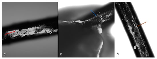 The surface of a dental archwire after incubation in a hen embryo. A visible sheath surrounds the archwire in group C (red arrow). In group E, the archwire surface is visible (blue arrow). In group G, numerous cells are visible directly adjacent to the archwire surface (brown arrow). DAPI. Magnification: 10×.