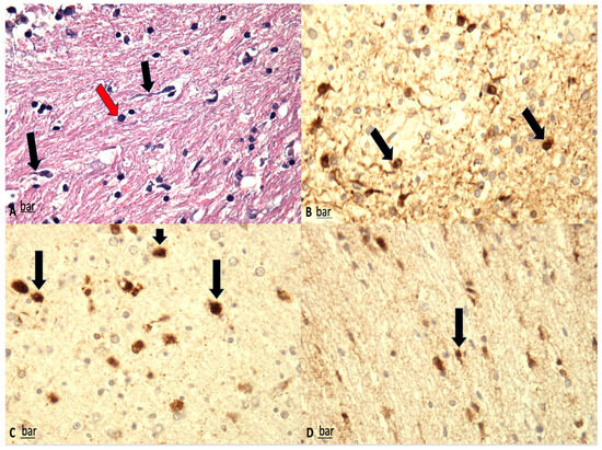 (A) Shrunken neurons associated with dark cell change (red arrows) and peri-neuronal vacuolation and swollen axons (black arrows) are visible (H&E, ×100). (B–D) β-APP immunostaining; significant reduction in β-APP-positive neurons, correlating well with the findings on H&E staining. Furthermore, β-APP-positive axons were fragmented and meandered, with multiple axonal retraction balls (black arrows) (magnification: ×150 (B), ×200 (C), ×100 (D).