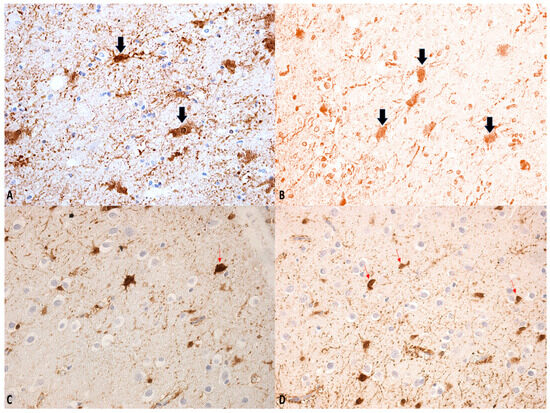 The primary immunohistochemical markers employed in the evaluation of DAI include β-amyloid precursor protein (β-APP) and glial fibrillary acid protein (GFAP) (Figure 2 and Figure 3) [8,59]. Astrocytic immunoreactivity for GFAP and S100 has proven valuable for estimating the timing of brain injury, with significantly reduced positivity observed in subacute or delayed cases. Furthermore, a potential correlation between the severity of trauma and the degree of GFAP/S100 immunopositivity has been reported [60].