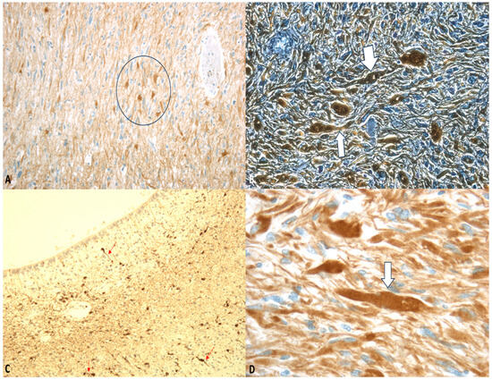 (A–D) GFAP staining: “Axonal varicosities” (within the circle). Beaded or segmented structures are indicated by the arrows. The white arrows highlight areas where the axon has been damaged and show varicosities. Magnification: ×75 (A), ×150 (B), ×75 (C), ×300 (D).