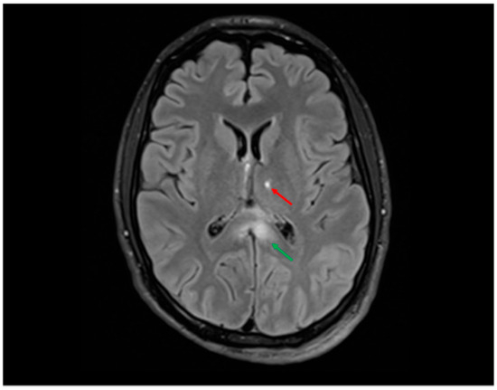 FLAIR sequence showing hyperintensities in the splenium of the corpus callosum (≈12 mm, green arrow) and at the left thalamo-capsular junction (≈9 mm, red arrow) in a young man involved in a high-speed motor vehicle collision (MVC). These locations are typical of grade II DAI according to the Adams classification and are frequently associated with impaired consciousness, cognitive deficits, and motor dysfunction. In this case, the patient presented with prolonged coma in the acute phase, in line with the neuroradiological findings.