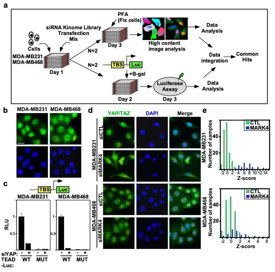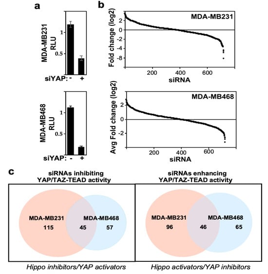 - Agarinis, C.; Orsini, V.; Megel, P.; Abraham, Y.; Yang, H.; Mickanin, C.; Myer, V.; Bouwmeester, T.; Tchorz, J.S.; Parker, C.N. Activation of Yap-Directed Transcription by Knockdown of Conserved Cellular Functions. J. Biomol. Screen. 2016, 21, 269–276. [Google Scholar] [CrossRef] [PubMed]