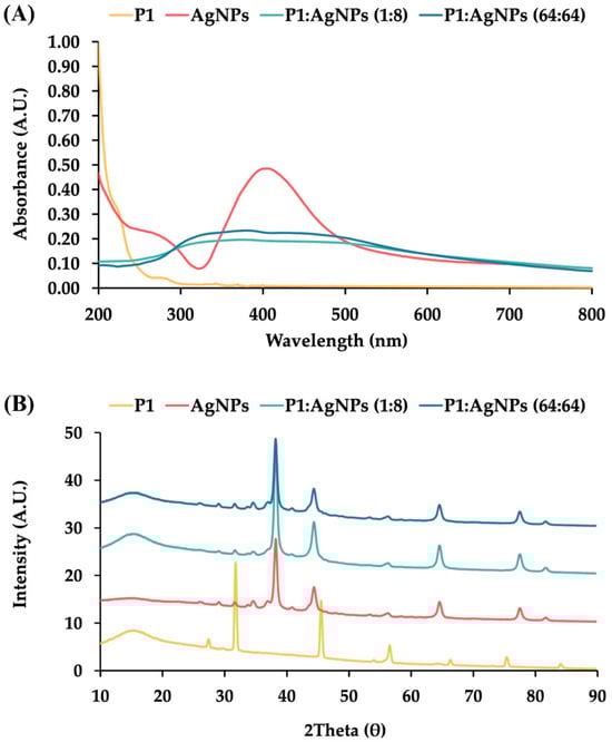 Characterization of P1, AgNPs, and their combinations. (A) UV—visible (UV—vis) absorption spectra and (B) Powder X-ray diffraction patterns of P1 (yellow line), AgNPs (red line), and their mixtures at concentrations of 1:8 μg/mL (light blue line) and 64:64 μg/mL (dark blue line).