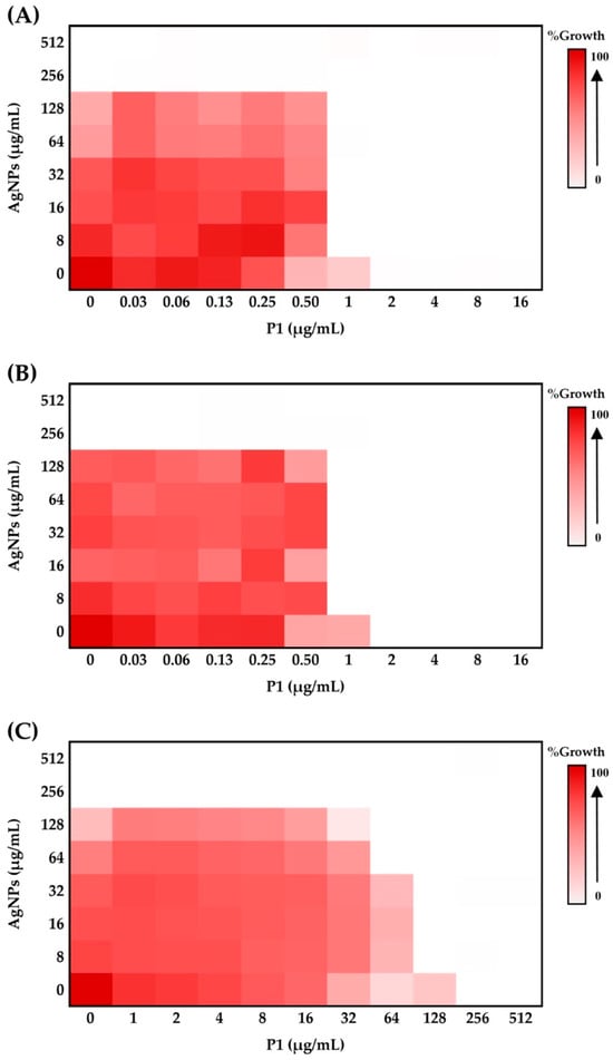 Effect of P1 and AgNPs at different concentrations on bacterial growth. (A) S. aureus TISTR 517, (B) MRSA isolate 2468, and (C) E. coli TISTR 887. Various P1 and AgNP combinations (0–512 µg/mL) affected the bacterial growth. A heatmap was utilized to visualize cell growth across different combinations. White indicates no growth, while red represents a high growth level. The concentrations of P1 and AgNPs in the figure represent the final concentrations of each substance included in the mixture.