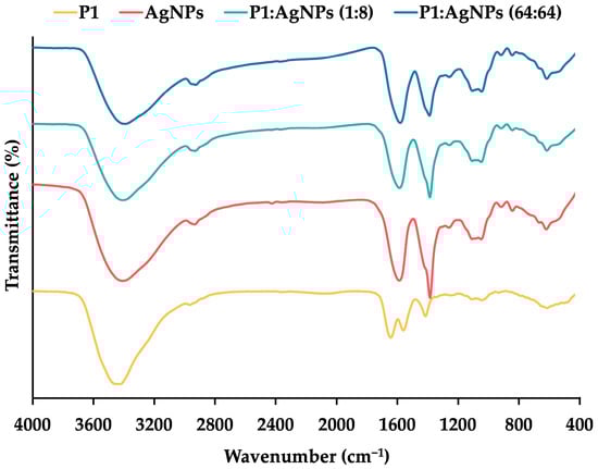 FT–IR spectra of P1 (yellow line), AgNPs (red line), and their mixtures at concentrations of 1:8 μg/mL (light blue line) and 64:64 μg/mL (dark blue line).