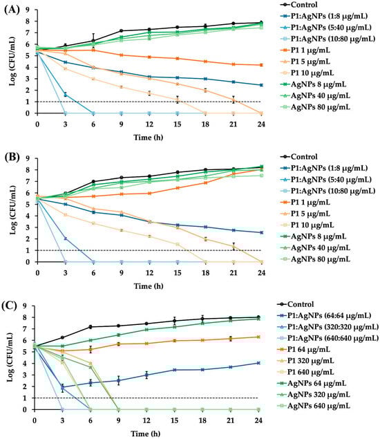 Time–kill kinetics of P1, AgNPs, and their combinations. Different P1 and AgNP combinations at 1×, 5×, and 10× MIC were incubated with the tested bacteria. (A) S. aureus TISTR 517 and (B) MRSA isolate 2468 were cultured in the presence of the P1 and AgNP combination at a 1:8 µg/mL concentration. (C) E. coli TISTR 887 was incubated with P1 and AgNPs at 64:64 µg/mL. The growth of untreated bacteria and treated bacteria with either P1 or AgNPs was also assessed. Each sample at the specified time points underwent serial dilution and plate counting. The limit of detection of the assay was 10 CFU/mL and is represented as the dashed line.