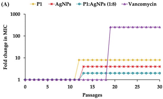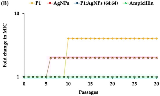 The induction of antibiotic resistance of S. aureus TISTR 517 and E. coli TISTR 887 was performed by incubating the tested bacteria with P1, AgNPs, and their combinations at a sub-lethal dose (0.5× MIC value). The surviving cells were collected and then cultured in MH broth at 37 °C with shaking at 150 rpm until they grew into the exponential phase. The resultant bacteria were repeatedly treated with each sample at the 0.5× MIC level for 30 passages. Each bacterial passage measured the MIC value of P1, AgNPs, and their combinations by broth microdilution assay. Standard antibiotics (vancomycin and ampicillin) were used as the controls. The development of drug resistance of bacteria was evaluated by a change in the MIC of each passage normalized to that of the initial generation [].