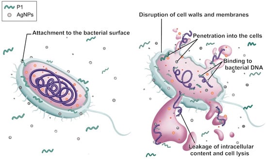 Proposed synergistic mechanism of P1 and AgNPs on the bacterial cell. The gray sphere corresponds to AgNPs, the green folded line depicts the P1 peptide, and the orange sphere together with the purple line represent bacterial cellular components.