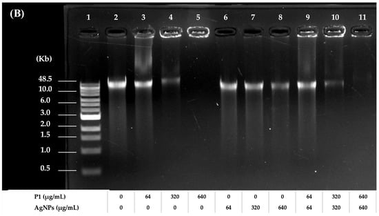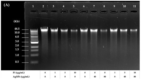 The genomic DNA of S. aureus TISTR 517 and E. coli TISTR 887 was isolated using the GF-1 bacterial DNA extraction kit (Vivantis Technologies Sdn. Bhd., Selangor, Malaysia). The overnight cell culture (1 mL) was centrifuged at 6000× g for 2 min, and the pellets were resuspended and then treated with lysozyme at 37 °C for 20 min. The digested cells were centrifuged, and the pellets were resuspended in a buffer containing RNase A and Proteinase K. The mixture was loaded into a GF-1 column and centrifuged at 10,000× g for 1 min. A washing buffer was added to the spin column, followed by column centrifugation. Fifty µL of sterile water was used to elute genomic DNA. The bacterial genomic DNA (50 ng) was incubated with different concentrations of P1, AgNPs, and their combinations at 37 °C for 1 h []. The untreated and treated DNA samples were loaded on a 1% agarose gel before staining the gel with a Safe-Green dye after electrophoresis. The DNA bands were visualized by a ChemiDoc XRS+ imaging system (Bio-Rad Ltd., Hercules, CA, USA), and the band shifts in the gel were detected and evaluated by Image Lab software (version 6.1.0).