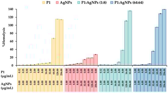 Hemolytic activity of the P1, AgNPs, and their combinations. The effect of different concentrations of P1, AgNPs, and their combinations at 1:8 and 64:64 µg/mL on the lysis of human erythrocytes was evaluated. Triton X-100 (1%) and phosphate-buffered saline (PBS) were used as positive and negative controls, respectively. The concentrations of P1 and AgNPs in the figure represent the final concentrations of each substance included in the mixture.