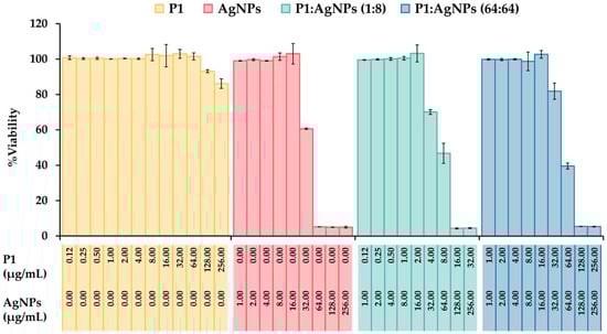 Cytotoxicity of the P1, AgNPs, and their combinations. Murine fibroblast L929 cells were treated with different concentrations of P1, AgNPs, and their combinations (1:8 and 64:64). The cell viability was assessed by MTT assay. PBS without samples was used as an untreated sample. The concentrations of P1 and AgNPs in the figure represent the final concentrations of each substance included in the mixture.
