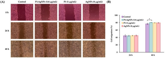 Cell migration in response to P1, AgNPs, and their combinations. (A) The samples (P1, AgNPs, and the 1:8 mixture) were incubated with the scratched fibroblast L929 cells for 24 and 48 h. (B) The wound width was measured, and the cell migration was calculated. An asterisk (*) indicates a significant difference at p-value < 0.05 compared to the untreated sample at each time point. The concentrations of P1 and AgNPs in the figure represent the final concentrations of each substance included in the mixture.