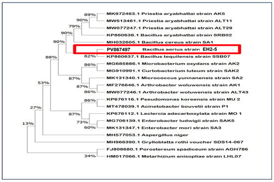 Phylogenetic tree based on 16S rRNA gene sequences showing the taxonomic position of Bacillus aerius strain EH2-5 (highlighted in red). The tree was constructed using the neighbor-joining method, and bootstrap values ≥ 50% from 1000 replicates are shown at the corresponding nodes. Bacillus aerius EH2-5 formed a clade with other well-characterized halotolerant or salinity-resistant bacterial strains, including members of the genera Bacillus, Priestia, Microbacterium, Curtobacterium, Arthrobacter, Pseudomonas, and Enterobacter. This phylogenetic proximity suggests a shared evolutionary adaptation to saline environments among the strains. Aspergillus niger and other distant taxa were included as outgroups.