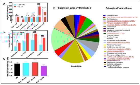 Metabolite production and genomic traits of Bacillus aerius strain EH2-5 under salinity conditions. (A,B) Quantification of beneficial metabolites produced by EH2-5: organic acids and amino acid derivatives involved in salinity tolerance and plant growth promotion. (C) Colony diameter of EH2-5 grown under salinity stress (150 mM NaCl), showing its halotolerant capacity. (D) Functional gene annotation of EH2-5 based on RAST analysis. The pie chart displays the relative abundance of annotated gene categories, with significant portions involved in carbohydrate metabolism (15.6%), amino acids and derivatives (15.4%), fatty acids and lipids (4.2%), stress response (3.5%), and virulence/disease defense (2.23%). Genes related to nitrogen (0.88%), phosphorus (0.92%), potassium (0.19%) metabolism, and iron acquisition (1.6%) highlight the strain’s genomic potential to confer abiotic stress tolerance and promote plant growth. Data represents the means of at least three independent biological replicates. Error bars represent standard deviations. Error bars represent standard deviations. Means were compared using Tukey’s post hoc test. * indicates p < 0.05, ** indicates p < 0.01, *** indicates p < 0.001, and ns: not significant.