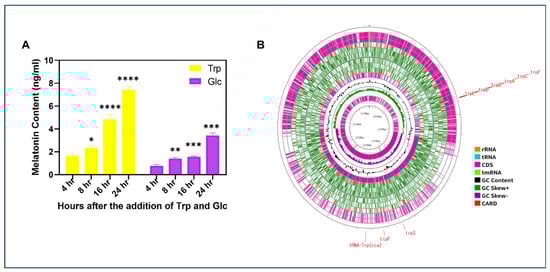 To determine whether glucose or tryptophan serves as the precursor for melatonin biosynthesis in strain EH2-5, LB medium was supplemented with either 1 mg/mL of tryptophan or glucose, inoculated with EH2-5, and sampled at 4, 8, 16, and 24 h post-inoculation for melatonin quantification. Comparisons between the tryptophan- and glucose-supplemented media revealed that melatonin production was significantly higher in the tryptophan-supplemented medium (Figure 3A). Specifically, in the presence of tryptophan, melatonin concentration reached 1.677 ng/mL at 4 h post-inoculation, whereas in the glucose-supplemented medium, melatonin levels reached only 1.58 ng/mL at 16 h. The highest melatonin concentration in the tryptophan-supplemented medium was 7.438 ng/mL at 24 h, while the glucose-supplemented medium reached a maximum of 3.434 ng/mL at the same time point. These findings indicate that EH2-5 utilizes tryptophan as a precursor for melatonin biosynthesis, likely following a tryptophan-dependent pathway similar to previously characterized melatonin synthesis routes. This conclusion is further supported by whole-genome sequencing (WGS) analysis, which revealed the presence of multiple tryptophan biosynthesis and metabolism-related genes in EH2-5, including trpP, trpS, trpE, trpB, trpD, trpA, and trpC (Figure 3B).