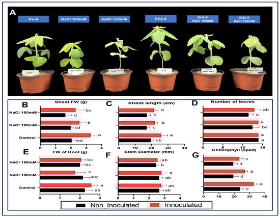 Phenotypic and physiological response of soybean seedlings to Bacillus aerius EH2-5 under salt stress conditions. (A) Representative images of soybean seedlings grown for 10 days under control (no salt), 100 mM, or 150 mM NaCl conditions, with or without EH2-5 inoculation. Plants treated with EH2-5 under 150 mM NaCl exhibited improved shoot growth, leaf development, and overall vigor compared to uninoculated controls under the same stress conditions. (B–G) Morphometric analysis of growth parameters, including shoot fresh weight, shoot length, number of leaves, root fresh weight, stem diameter and chlorophyll. Values are shown as the means ± SD (n = 12) and significant differences at p < 0.05 (Tukey test) are indicated by different lowercase letters above the columns.