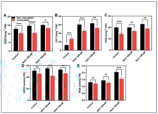 EH2-5 mitigates oxidative stress induced by salinity stress. (A–C) Antioxidant content: (A) SOD (superoxide dismutase), (B) CAT (catalase), and (C) POD (peroxidase) in leaves of soybean grown under normal and salinity stress conditions for 10 days after being inoculated with EH2-5. (D) Quantification of H2O2 in soybean leaves of plants subjected to NaCl-induced stress following EH2-5 inoculation. (E) Quantification of MDA. Data correspond to the means of three independent biological replicates. Error bars represent standard deviations. Means were compared using Tukey’s post hoc test. * indicates p < 0.05, ** indicates p < 0.01, *** indicates p < 0.01, **** indicates p < 0.001, and ns: not significant.
