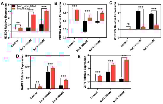 Relative expression of stress-responsive genes in soybean under salinity stress following inoculation with Bacillus aerius EH2-5. Quantitative real-time PCR analysis was performed to assess the transcript levels of key genes involved in (A) abscisic acid biosynthesis (GmNCED3), (B–D) dehydration and salinity response (GmDREB2A, GmWRKY27, GmNAC29), and (E) metal ion transport (GmZIP1). The upregulation of GmZIP1 suggests a possible role for zinc homeostasis in stress adaptation facilitated by Bacillus aerius EH2-5. Data are presented as mean ± standard error (n = 3), normalized against internal control genes. Data corresponds to the means of at least three independent biological replicates. Error bars represent standard deviations. Means were compared using Tukey’s post hoc test. * indicates p < 0.05, ** indicates p < 0.01, *** indicates p < 0.001, and ns: not significant.