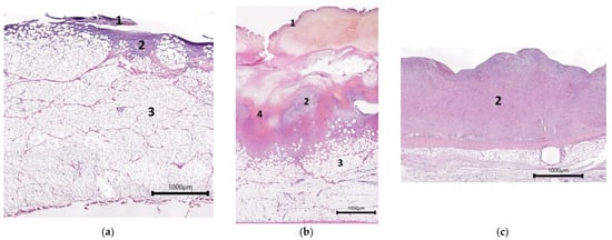 By Day 42, the surfaces of all wounds were completely epithelialized. The wound border could not be seen microscopically because the skin structure was completely restored in the peripheral area of the wound crater. Papillary and reticular layers of the dermis were clearly visible under the epidermis in this area, and hair follicles and glands were available (Figure 11). On Day 42, three areas could be distinguished in all types of experimental wounds: (1) the restored dermis, (2) the remodeling area characterized by multidirectional bundles of collagen fibers and active fibroblasts, and (3) the granulation tissue area. Visually, the experimental wound defects typically had a more uniform thickness, and the remodeling area was more extensive than in the control wound defects (Figure 11).