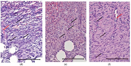 Histological view showing the condition of the central parts of control wound defects on Day 7—hematoxylin and eosin staining: (a–c) overall views; (d–f) structure of granulation tissue. Note: 1—leukocyte–necrotic scab; 2—granulation tissue; 3—adipose tissue; 4—hemorrhagic exudate; black arrow—fibroblasts; red arrow—a vertical blood vessel.