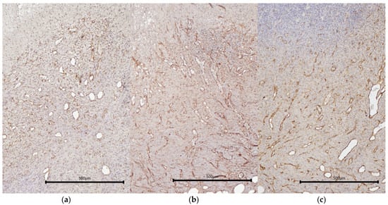 Vessels of different diameters could be clearly visualized in the area of granulation tissue in all types of wounds, being immunohistochemically stained using CD31 (Figure 4). There were no statistically significant differences found between wound defects during morphometric assessment of either the total area of vessels within the granulation tissue in the fields of view or of the percentage of the area of vessels from the total area of the field of view. However, in the mSE-treated wounds, a tendency to an increase was noted (Figure 5).