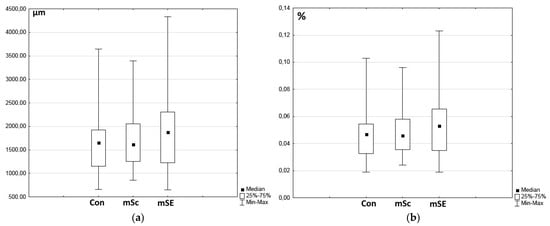 More active regeneration, where mScs and mSEs were used, was confirmed by the results of morphometric examination. For instance, the percentage of cells expressing Ki-67, a marker of proliferating cells, relative to the total number of cells in the field of view, was statistically significantly higher in wounds with mSc and mSE grafts compared to the control wounds (Figure 6a). However, the assessed indicator did not statistically significantly differ between wounds with mSc or mSE grafts. Sample analysis showed that 75% of the values for the assessed wound defect index with mSEs were within the range from 9.29 to 29.91%, whereas in the control wounds, they were within the range from 7.15 to 16.31% (Figure 6b), indicating that the proliferative activity of cells in wounds with mSEs was more pronounced. A total of 75% of the values for the assessed wound defect index with mScs were within the range from 8.00 to 22.55% and had an intermediate value between the control wounds and wounds with mSEs. Thus, both the mSc and mSE grafts enabled cells to maintain pronounced proliferative activity. This could be due to the biological activity and structure of these scaffolds. In the case of mSEs, the effect was more pronounced, probably due to the pASCs in the mSE, as these secrete growth factors and interleukins capable of impacting the proliferative activity of cells.