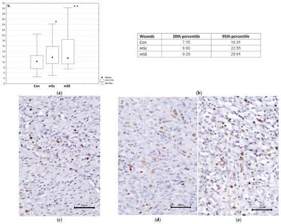 Proliferative activity of cells. (a) Percentage of cells expressing Ki-67 relative to the total number of cells in the fields of view (10 fields of view were analyzed from each wound defect, so n = 60 for each wound type); (b) analysis of data distribution between the 20th and 95th percentiles; (c–e) proliferating cells in granulation tissue, immunohistochemical staining—Ki-67; (c) Con; (d) mSc; (e) mSE. Note: * p ˂ 0.05; ** p ˂ 0.001 in comparison with Con, using the Wilcoxon test.