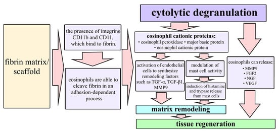 In wounds with mSc and mSE grafts, abundant infiltration of granulation tissue with eosinophils (Figure 5b and Figure 6b) was noted. Eosinophils express a unique complex of cell surface receptors related to adhesion, homing, and migration in tissues [,]. It is known that the eosinophil membrane contains integrins CD11b and CD11, which bind to fibrin [,,,,] and that eosinophils can cleave fibrin in an adhesion-dependent manner []. M.E. Coden et al. also showed that fibrin is a specific trigger for the cytolytic mode of eosinophil degranulation. As fibrin is the main structure-forming protein of the scaffolds of the implantable mSc and mSE constructs, presumably, this fibrin “attracts” eosinophils from the surrounding tissues and causes their active recruitment into the structure of the constructs. Relatively recently, eosinophils have begun to be considered as participants in regeneration. During cytolytic degranulation, they release cationic proteins [,,] that can activate epithelial cells to synthesize remodeling factors such as TGF-α and TGF-β 1 [] as well as modulating mast cell activity [,]. Thus, eosinophils release a number of proteins that are directly involved in tissue regeneration processes [,] (Figure 7).
