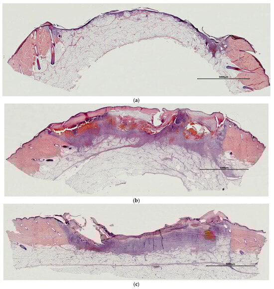 Example of the general appearance of wound defects in one animal on Day 7. (a) Con; (b) mSc; (c) mSE; hematoxylin and eosin staining.