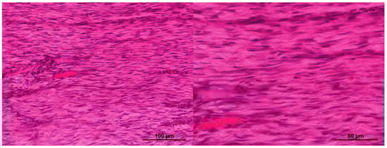 It should also be noted that, in some cases, in the central areas of the control wounds, the granulation tissue was similar to scar tissue and was formed of thick bundles of horizontally directed collagen fibers, though it also contained a significant number of cells (Figure 13). In such cases, horizontally oriented fibroblasts, each with a narrow, elongated nucleus and poorly developed cytoplasm, were located between the fiber bundles. The blood vessels present were thin-walled and also horizontally oriented.