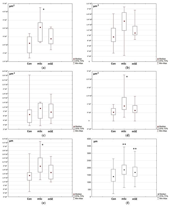 There were no statistically significant differences between the groups for this parameter. However, attention should be paid to the scattering values within the samples. They are lowest in wounds treated with mSEs. Similarly, the scatter within the samples in wounds with mSEs is also lower for a number of other analyzed parameters (Figure 14a,b,d–f). This also indicates that the regeneration in wounds with mSEs is more uniform. However, the regeneration process in the mSE wounds was more intensive compared to that for mSc-treated ones, as evidenced by the former’s lower values of granulation tissue space and thickness. The significantly lower values of these parameters in the mSE wounds indicate a higher degree of regeneration completion, which is consistent with the overall histological view of the wound defects on Day 42 of the study (Figure 14d,f).