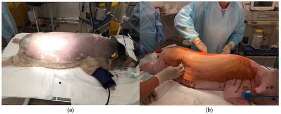 The animals were cleaned using a shower with a body sponge and antiseptic soap. Then, the hair in the areas of the intended surgical intervention was carefully shaved using an animal clipper. The animal was transported to the operating table on a gurney. The surgical area was first treated with a 5% iodine solution in alcohol, then with 70% ethyl alcohol. All further surgical procedures were performed by an experienced surgeon (Figure 15a,b).