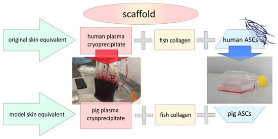 To conduct this experimental study on the animals, a model skin-equivalent (mSE) was needed—a method corresponding to the “homologous drug” strategy. To form such an mSE, the original allogeneic components—human adipose-derived stem cells (hASCs) and human blood plasma cryoprecipitate in the source skin-equivalent intended for use in humans—were replaced by allogeneic ones for pigs (pig adipose-derived stem cells—pASCs and pig blood cryoprecipitate) (Figure 16).