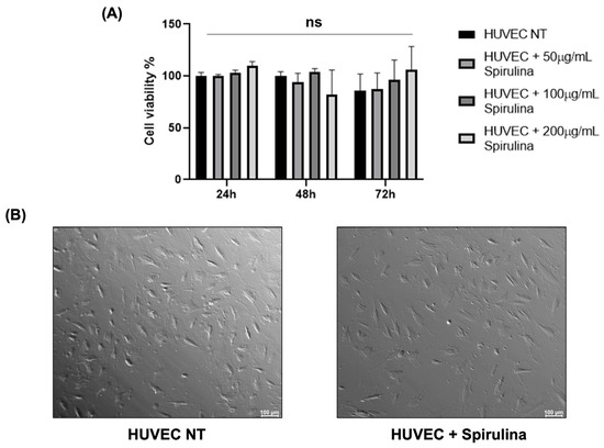 Cytotoxic effects of spirulina treatments on HUVECs. (A) Cell viability rate of HUVECs by MTS assay to evaluate spirulina cytotoxic effect. Three replicates of each sample were analyzed by three independent experiments. Data are presented as mean bars ± SEM. The p-values were calculated using a 2-way ANOVA test (ns, not significant); (B) bright-field microscopy image of HUVEC NT and HUVECs after 72 h pretreatment with 50 µg/mL spirulina. Images were acquired using the Leica MICA Microhub system with a 10× magnification.