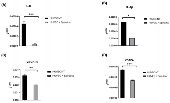 qRT–PCR analysis of the mRNA levels. Changes in the relative expression in the HUVEC line after 72 h pretreatment with 50 µg/mL spirulina of (A,B) pro-inflammatory cytokines (IL-8 and IL-1β) and (C,D) vascular biomarkers (VEGFR2 and VEGFA). The values are mean ± SEM of three independent experiments, normalized by the expression of GAPDH. The p-value was calculated by a t-test with 0.001 ≤ p ≤ 0.1. (* p < 0.05, ** p < 0.01, *** p < 0.001).