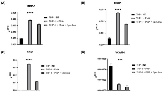 qRT–PCR analysis of the mRNA levels of THP-1 cells. Changes in the relative expression in the THP-1 cell line after PMA and spirulina treatment of (A) chemokines (MCP-1); (B,C) scavenger receptors (MSR1, CD36); and (D) biomarker of vascular cell adhesion (VCAM-1). The values are mean ± SEM of three independent experiments, normalized by the expression of GAPDH. The p-values were calculated using a one-way ANOVA test (*** p < 0.001; **** p < 0.0001).