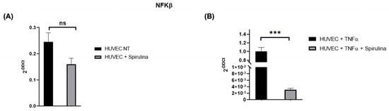 qRT–PCR analysis of the mRNA levels of NFKβ. Changes in the relative expression of NFKβ in the HUVEC line after spirulina treatment with (A) and without (B) TNFα. The values are mean ± SEM of three independent experiments, normalized by the expression of GAPDH. The p-value was calculated by a t-test with 0.001 ≤ p ≤ 0.1 (ns = not significant; *** p < 0.001).