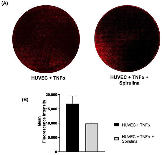 We next evaluated whether spirulina affects monocyte adhesion to endothelial cells under inflammatory conditions. HUVECs were pre-treated with spirulina and stimulated with TNF-α, followed by a monocyte adhesion assay. The number of adhered monocytes was significantly reduced in the spirulina-treated condition compared to TNF-α-only controls (Figure 5A,B), indicating a potential role for spirulina in reducing endothelial–leukocyte interactions during early atherogenesis.
