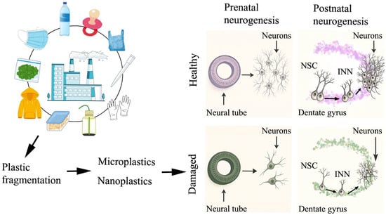 Plastic fragmentation generates microplastics and nanoplastics. These pollutants exert deleterious effects on both embryonic and adult neurogenesis. NSC: neural stem cells. INN: immature newborn neurons.