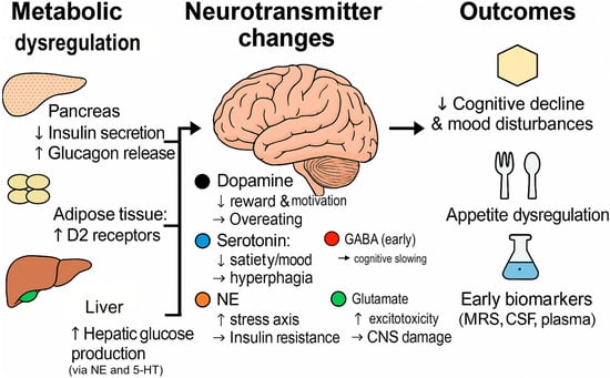Neurotransmitters—key chemical mediators operating within the CNS and peripheral tissues—are essential for regulating energy balance, blood sugar levels, appetite, and insulin sensitivity. Emerging evidence highlights the complex connection between neurotransmitter signaling pathways and metabolic control networks. Specifically, brain insulin resistance (BIR) disrupts dopaminergic and serotonergic neurotransmission involved in reward processing, which promotes hyperphagia and worsens metabolic dysregulation [,,].