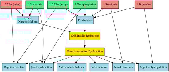 Once T2D is clinically diagnosed, dysregulation of neurotransmitter systems becomes more pronounced, affecting central pathways, the HPA axis, and neurobehavioral outcomes [].