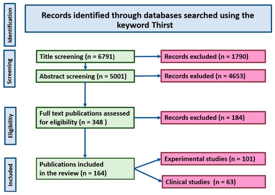 The selection of studies discussed in the present review was performed using the Primary Statement for Preferred Reporting Items For Systematic Reviews and Meta-Analyses (PRISMA) method []. The identification of publications through the PRISMA approach was performed through a literature search carried out for studies published between January 1960 and July 2025 with the application of PubMed, EMBASE and Scopus databases. The following criteria were applied for evaluation of each study before its inclusion to the reference list: (1) importance of the study for understanding of the physiology and pathology of thirst, (2) novelty of the study in the specific domain of the thirst science, and (3) the scientific reliability of methods applied in the study, including adequacy of statistical analysis. The PRISMA flow diagram is shown Figure 1. The selection of studies included to the review was based on their relevance to the questions discussed in the review and their scientific contribution.