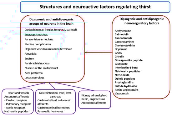 The following abbreviations have been used throughout the text: Ang II—angiotensin II, ADH—antidiuretic hormone, AVP—arginine vasopressin, AV3V—anterior area of the wall of the third ventricle, BBB—blood–brain barrier, CB—cannabinoid, CCK—cholecystokinin, CVO—circumventricular organ, GABA—gamma aminobutyric acid, GLP—glucagon-like peptide, ICV—intracerebroventricular, IL—interleukin, L-NAME—(ng-nitro-L-arginine methyl ester), LC—locus coeruleus, LT—lamina terminalis, MFB—medial forebrain bundle, MPA—median preoptic area, NMDA–N-methyl-D-aspartate receptor, NO—nitric oxide, NOS—nitric oxide synthase, NTS—nucleus of the solitary tract, OVLT—organum vasculosum laminae terminalis, PBA—parabrachial nucleus, PG—prostaglandin, PRA—preoptic area, PRISMA–Primary Statement for Preferred Reporting Items For Systematic Reviews and Meta-Analyses, PVN—paraventricular nucleus, RAS—renin–angiotensin system, RVLM—rostral ventrolateral medulla, SFO—subfornical organ, SH2—sulfide hydroxide, SIADH—syndrome of inappropriate secretion of ADH, SON—supraoptic nucleus, T1D—diabetes mellitus of type 1, T2D—diabetes mellitus of type 2, TRPV—transit receptor potential cation channel, and V1R and V2R—vasopressin receptors.