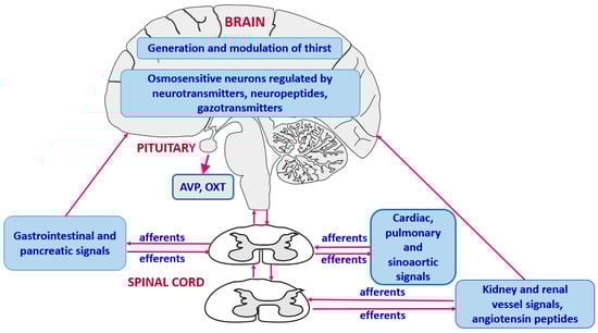 Regulation of thirst engages multiple excitatory and inhibitory messengers, including all classical neurotransmitters, several neuropeptides, gaseous transmitters and other active molecules [,,,] (Figure 2).
