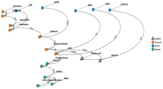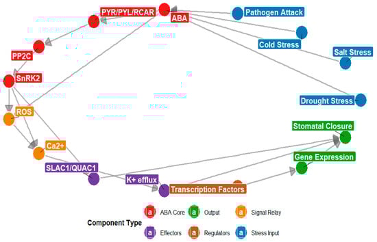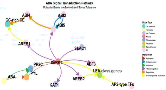 Plants, as sessile organisms, are frequently subjected to a wide range of abiotic stresses, such as drought, salinity, and temperature fluctuations, which collectively threaten agricultural productivity and global food security. To survive under these adverse conditions, plants have developed intricate physiological and molecular mechanisms to detect, signal, and respond to environmental cues [,,]. These mechanisms are mediated by a network of signaling molecules, among which ABA plays a pivotal role. ABA is not only crucial for immediate stress responses, such as stomatal closure, but also for long-term adaptive processes like seed dormancy and gene expression reprogramming. ABA’s function as a central regulator of stress tolerance is rooted in its dual ability to mediate rapid physiological responses and orchestrate transcriptional networks [,]. Under conditions of drought or high salinity, for instance, ABA accumulates in guard cells, triggering ion channel activities that result in stomatal closure to minimize water loss. Simultaneously, ABA modulates gene expression in various tissues, enhancing the production of stress-protective proteins and metabolites [,]. Despite decades of research, the full complexity of ABA’s regulatory network remains a topic of intense investigation, particularly its interactions with other signaling molecules and environmental factors.
