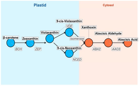 Abscisic acid (ABA) biosynthesis is a tightly regulated process that begins in the plastids, where carotenoids such as 9-cis-violaxanthin and 9-cis-neoxanthin undergo oxidative cleavage by the enzyme 9-cis-epoxycarotenoid dioxygenase (NCED) [,]. This reaction produces xanthoxin, a pivotal intermediate that is subsequently transported to the cytosol, where it is converted into ABA through a series of enzymatic reactions. The transport of xanthoxin from the plastid to the cytosol remains an understudied aspect of the process, with recent studies suggesting the involvement of transporter proteins that could serve as regulatory bottlenecks [,].