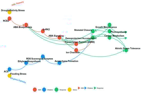The relationship between ABA and ethylene is complex, as the two hormones often exhibit antagonistic behavior during stress responses. Ethylene suppresses ABA-induced stomatal closure, prioritizing gaseous exchange and photosynthesis [,]. This antagonism is critical for plants facing multiple stresses, as ABA promotes stomatal closure to reduce water loss, while ethylene maintains stomatal opening for gas exchange and photosynthesis.