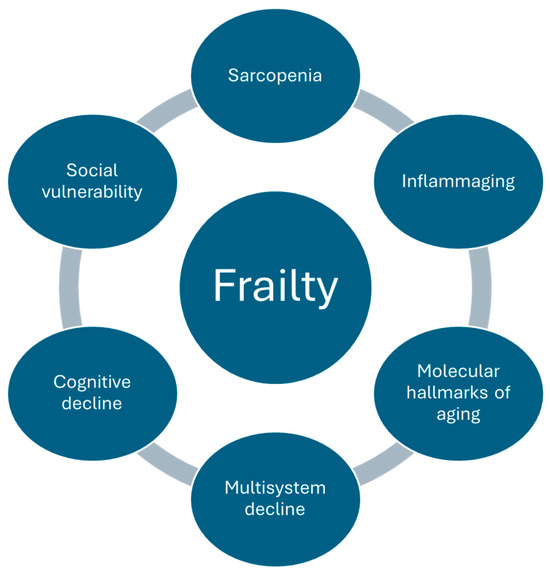 Frailty is largely multifactorial in its cause and multidimensional in its impact (Figure 1) [18,19]. This is further supported by the fact that the frailty phenotype and frailty index often disagree on frailty classification for a substantial number of patients, despite both having clinical applicability and predictive value [20]. Its pathology is influenced by various processes such as inflammation, dysregulation of organ systems, sarcopenia, oxidative stress, and cellular and molecular signaling pathways.