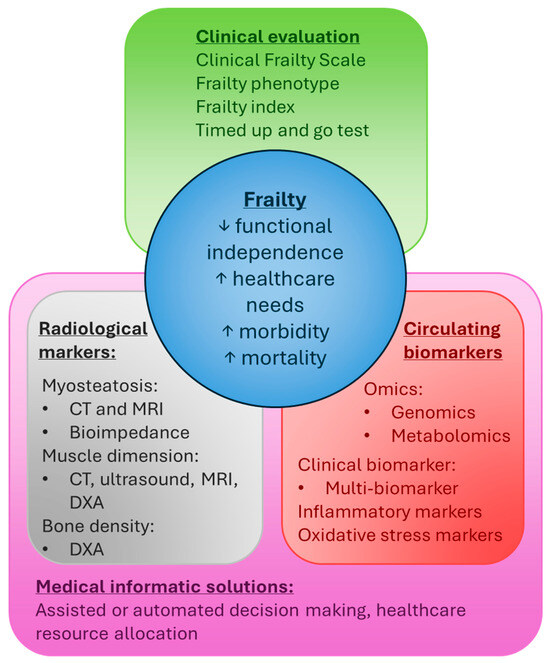 In summary, frailty is a complex biological, psychological, and social process. While clinical screening and diagnosis are the current gold standard, it is not without its limitations. Opportunistic or deliberate radiological evaluation could provide valuable insight that can facilitate the recognition of frailty. Better understanding of the biochemical processes associated with frailty could lead to the development of biochemical assays that offer alternative options for screening.