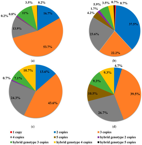Distribution of SMN2 exon 7 copy numbers: (a) Distribution of SMN2 exon 7 copy numbers among 490 patients with a homozygous deletion of SMN1 exon 7, identified through selective 5q SMA screening prior to the launch of pilot projects and newborn screening in 2020–2021 (Selective Screening Group 1, SS2020–2021); (b) distribution of SMN2 exon 7 copy numbers among 288 newborns with a homozygous deletion of SMN1 exon 7, identified through newborn screening in 2023–2024 (NBS2023–2024); (c) distribution of SMN2 exon 7 copy numbers among 140 patients with a homozygous deletion of SMN1 exon 7, identified through selective 5q SMA screening during the implementation of newborn screening in 2023 (Selective Screening Group 2, SS2023); (d) distribution of SMN2 exon 7 copy numbers among 86 patients with a homozygous deletion of SMN1 exon 7, identified through selective 5q SMA screening during the implementation of newborn screening in 2024 (Selective Screening Group 3, SS2024).